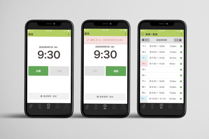 【プロジェクト概要】 建設業向けグループウェアの既存ネイティブアプリへ勤怠管理機能を追加するため、UIデザインを追加制作。 ※既存デザインは他デザイナーさんが担当 【コンセプト】 ・シンプル ・わかりやすいレイアウト ・説明書を見なくても操作できる 【意図・目的・課題】 ・ターゲットは40代以上の建設業界で働く男性で、普段はLINE以外ほとんどスマホやパソコンを利用しない方が多い ・職人さんが勤怠に関する情報(追加・修正)をこの画面で完結に行えるようにしたい 【チーム構成】 ・PdM1名(クライアント) ・デザイナー1名 【提案内容】 ・ボタンリンクのアクティブ・非アクティブを明確にするなど、機能がシンプルな反面、誤タップを引き起こす可能性がありそうなので、「今自分が何をすることが出来るのか」を明確にした ・勤怠入力しようとしている今、何時なのか?がすぐわかるよう時刻を大きく表示 ・「今、自分が何をしたのか」がわかるよう、ボタンを押したら上部に赤い通知を表示 ・既存のデザインと操作性が違くならないよう統一させた 【結果・評価】 ・「シンプルで操作性がわかりやすい」とご好評いただけた 【担当領域】 ・プロトタイプ制作 ・デザイン制作 【使用ツール】 ・Adobe XD(プロトタイプ、デザイン制作)