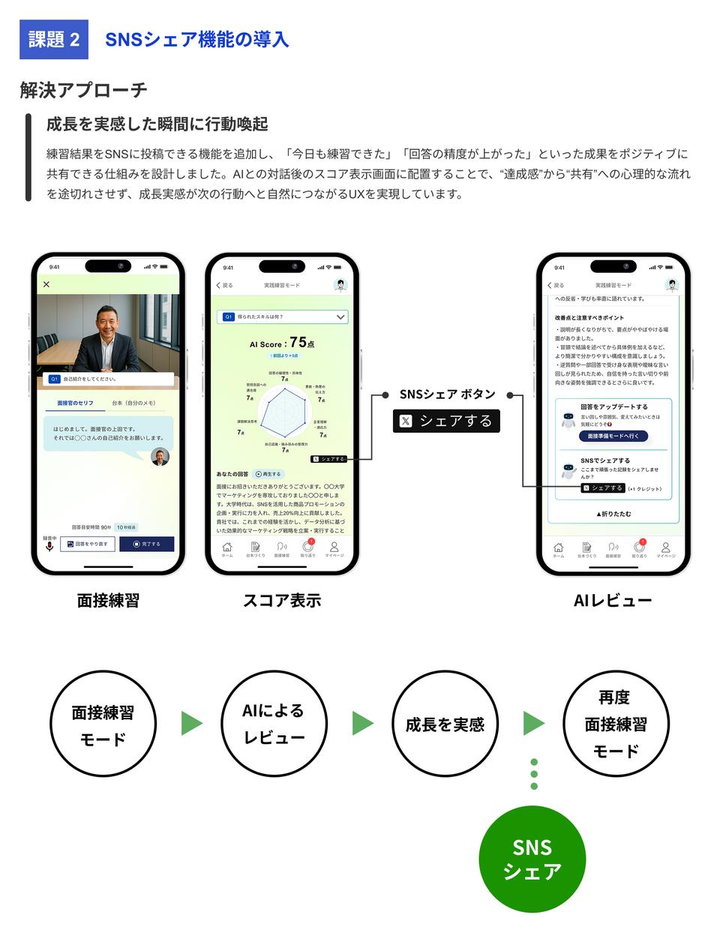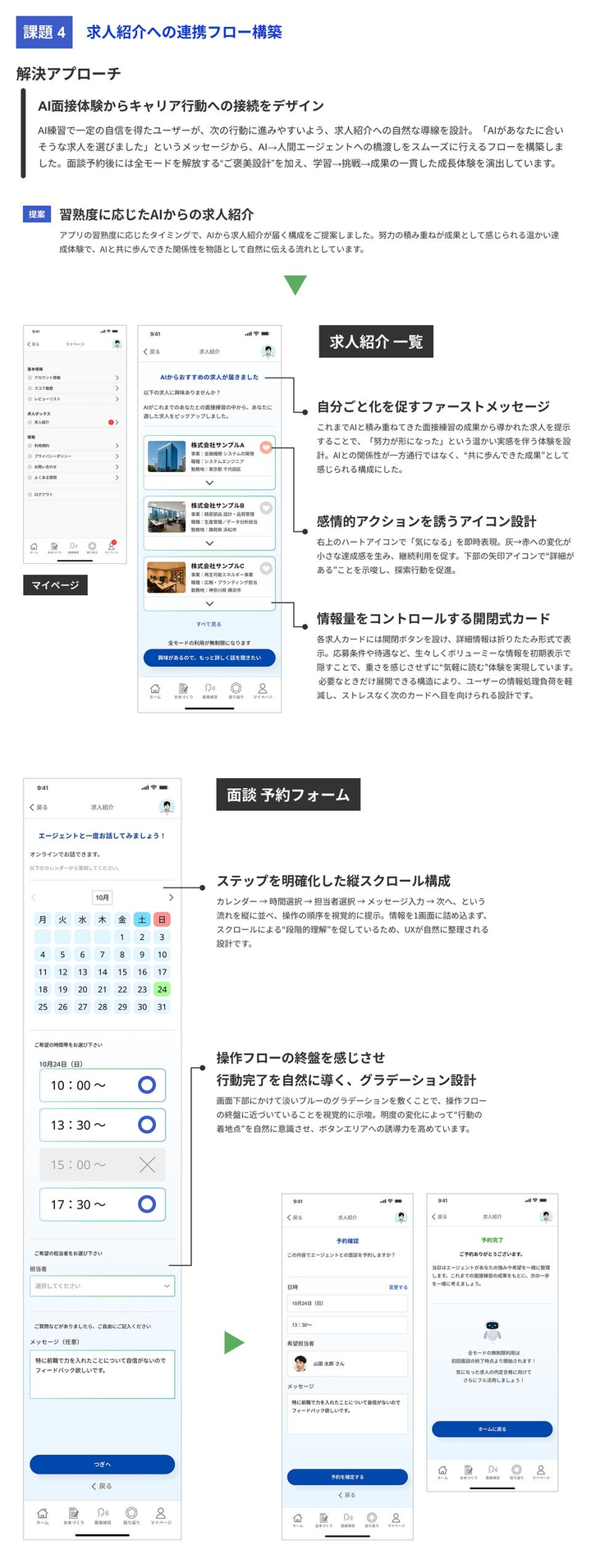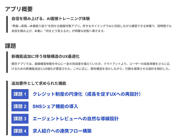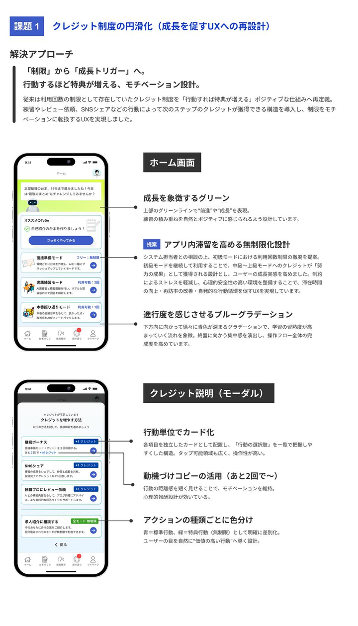 ■ターゲット: 直近に面接を控え、不安を感じながらも自信をつけたい20〜30代の就職・転職活動者。 ■目的: AIと対話しながら模擬面接を行い、回答内容を客観的に振り返れるAI面接実践アプリ。その現行デザインを引き継ぎつつ、クレジット獲得やレビュー導線などの体験を再設計し、アプリ全体のUXを最適化。新機能追加に伴い、継続利用のしやすさと「練習から成長へのつながり」を強化するUXを目指しました。 ■制作意図: 既存のAI面接対策アプリをベースに、ユーザー体験の継続性を高める新機能を設計。「クレジット制度」「エージェントへのレビュー依頼」「SNSシェア」「求人紹介フロー」などの導線を再構築し、AIとの対話体験を単なる練習で終わらせず、「自信の獲得」から「次の行動」へとつながるUXを目指しました。また、練習量・レビュー依頼・SNSシェアなど、行動のモチベーションを保つ仕組みを整理し、ユーザーが自然とアプリを継続利用したくなる構造を意識しています。 ● 担当範囲:情報設計・UIデザイン ● 制作時間:3週間 ● 使用ツール:Figma ●︎ イメージキーワード:信頼感・清潔感・前向き・整然・明るさ・近未来