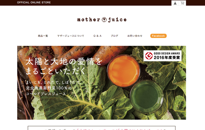 コールドプレスジュース「mother juice」のオンラインストア。「飲む人」「つくる人」「売る人」が、互いに支え合うしくみ作りが、2016年度グッドデザイン賞受賞。 ブランドのディレクション・デザインで関わっています。