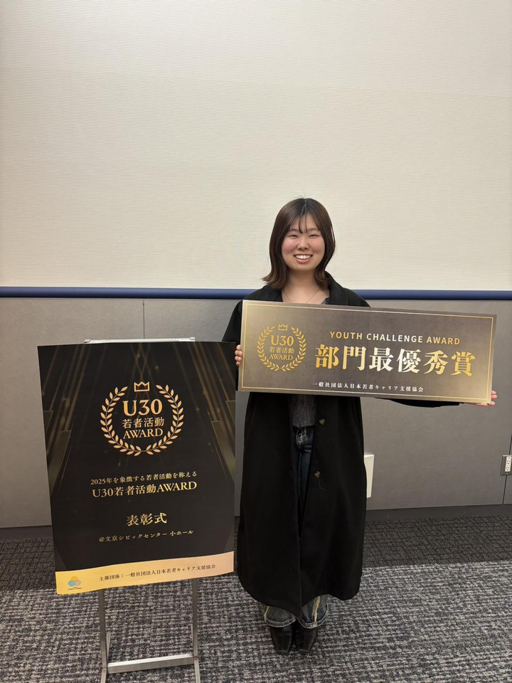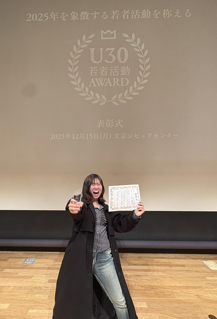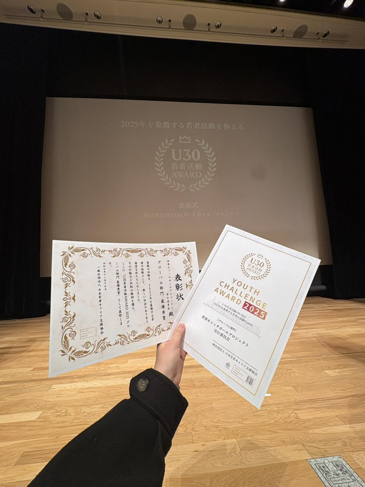 U30若者活動AWARD 2025 グローバル部門最優 秀賞 U30 若者活動AWARD 2025 活動大賞を受賞しました。 全国から推薦された50の若者活動の中で、社会へのインパクトと挑戦が評価されました。 日は無事終わりましたが、このように賞という形で、認められる機会がなかったのでとても貴重な機会になりました!