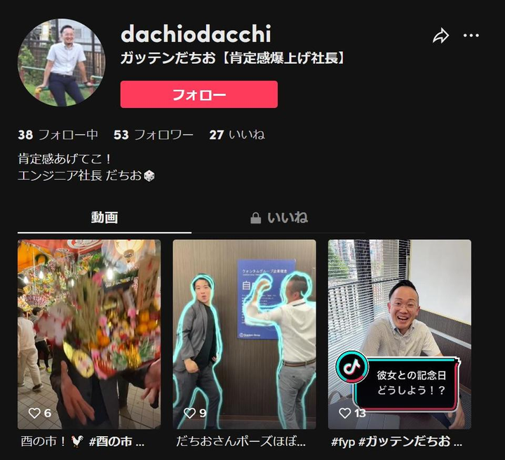 Tiktokアカウント「がってんだちお【肯定感爆上げ社長】」更新中! https://www.tiktok.com/@dachiodacchi 企画、動画編集、運用まで全て担当。