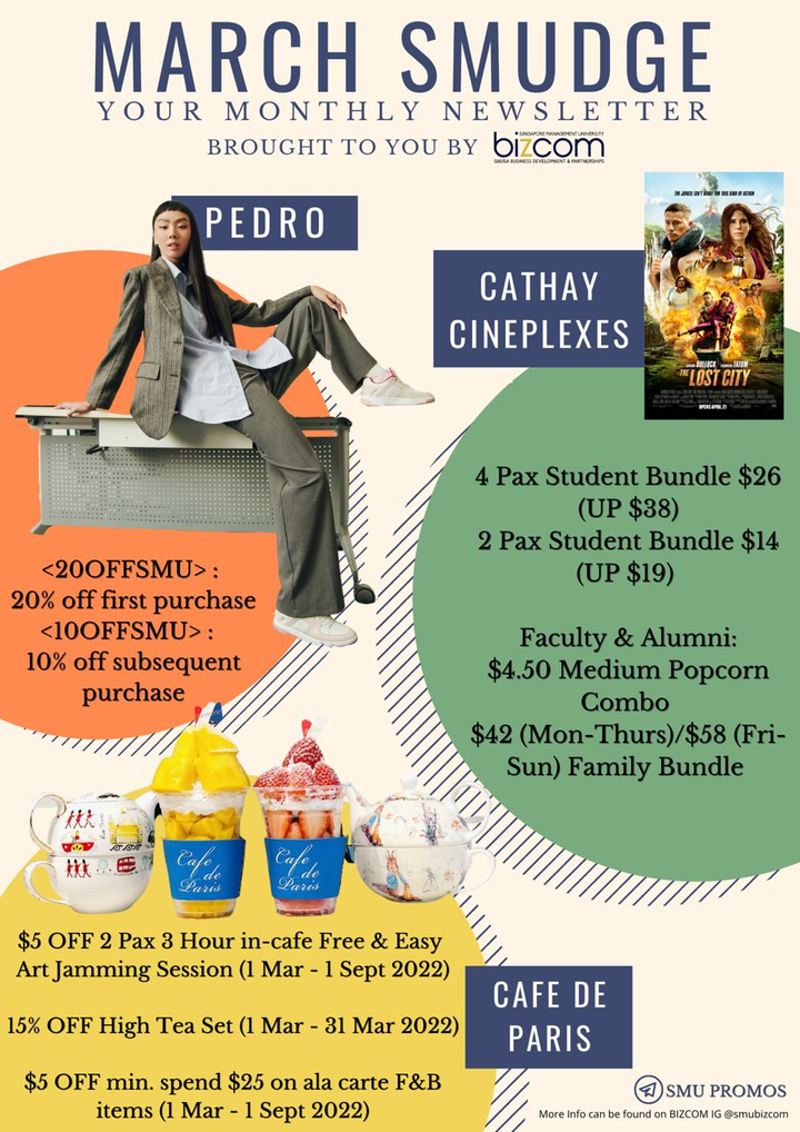 These are examples of a few collaterals i have done for our clients at SMU BIZCOM. They were subsequently uploaded onto BIZCOM Instagram and Facebook page. The SMUDGE poster was sent out to all SMU undergraduate as an EDM.