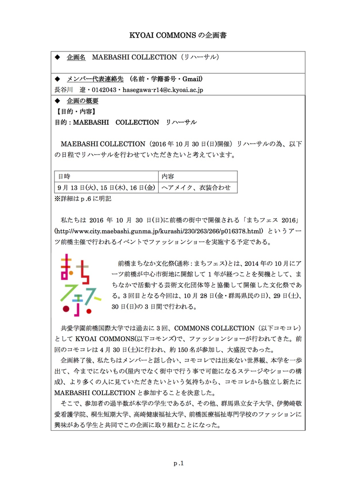 2016年10月30日にアーツ前橋(美術館)主催の「まちフェス2016」というイベントに副代表として、ファッションショーを開催しました。そこでのリハーサルとして、本学の施設を利用した際に提出した企画書です。