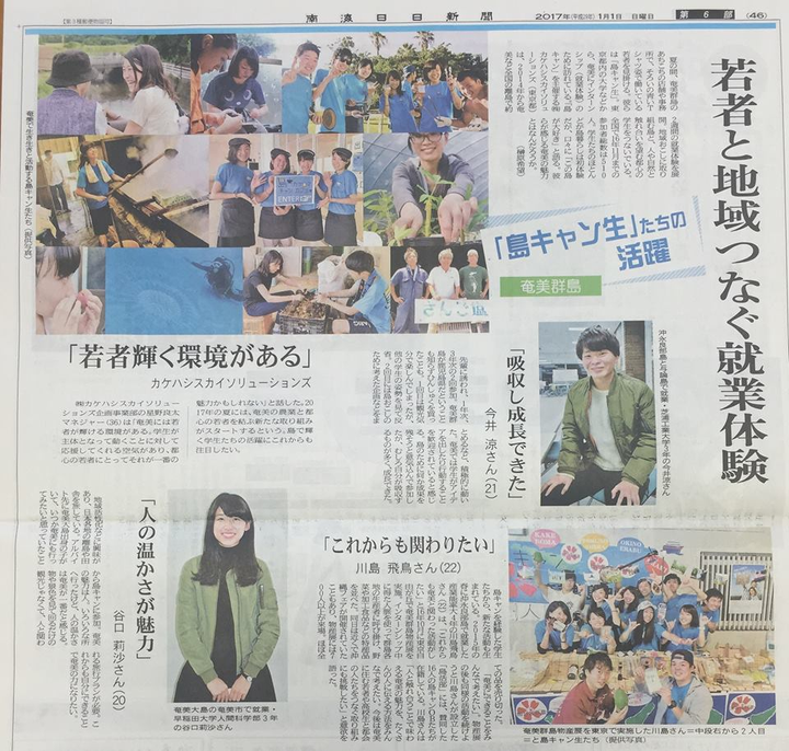 南海日日新聞様に私の「島キャン」での就業体験談を取り上げていただきました。 「吸収し成長できた」 私にとって、エラブでの就業もヨロンでの就業もこの言葉に尽きます。 離島での就業を体験すること。島のことを知ること。島民の方々と交流すること。 そして、色々な視点や価値観を持った島キャン生と交流すること。 大いに知見を広くすることができたと思います。