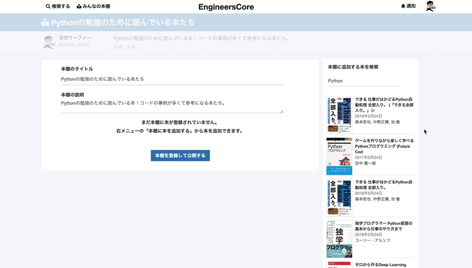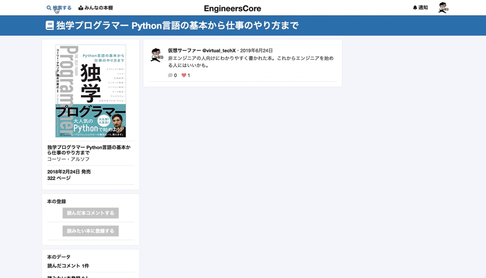 技術書が検索できるサービス。 【利用技術】 Python、Django、Django REST Framework、Angular、HTML、CSS、MySQL 【主要機能】 ・読んだ技術書の本棚登録ができる。 ・読みたい技術書を検索できる。 ・他人の本棚に登録された本を見ることができる。 (Google Cloud Platformで動かしていましたが、収益化できなかったので閉じました。)