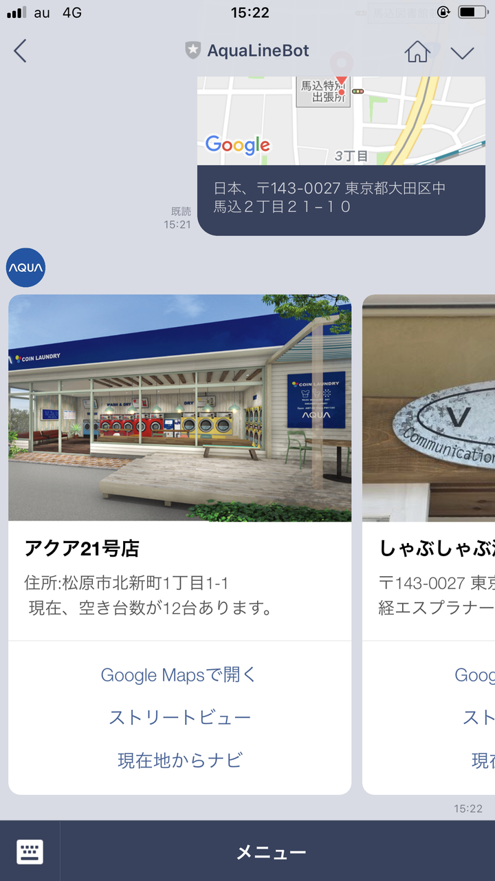 10月に行われた株式会社AQUAとG`s Academy Tokyo主催にて行われたハッカソンで開発したLine Botです。 Lineで現在地をmapから入力すると近くのAQUAランドリーノロケーション情報、洗濯機の空き情報、洗濯が終わるまでの時間を有効活用できるように、ぐるなびAPIを使用して一番近くの飲食店情報を表示してくれるLine Botを開発しました。 開発メンバーは3人、時間は2日間、結果は3位でした。