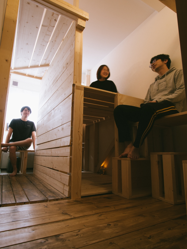 住んでいる三軒茶屋にあるシェアハウスにて、ドミトリー部屋を制作。 コンセプト設計、提案、施工まで全てを一貫して担当 これまで1人部屋であったサイズの部屋に3人のベッド空間をもうけ、収納や本棚などを充実させた。 住みながら住み人にアレンジしてほしいという想いを込め部屋内に工具やDIY関連の書籍も配置している。