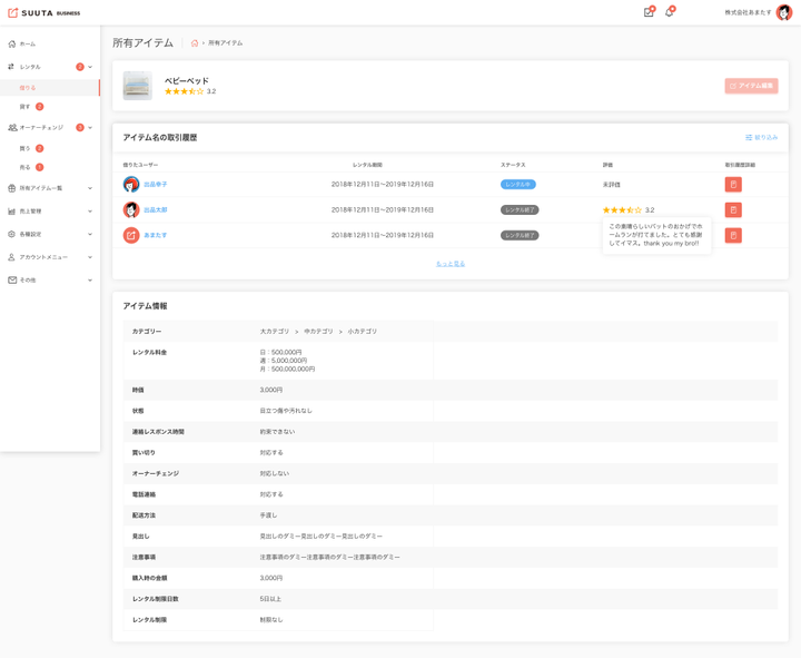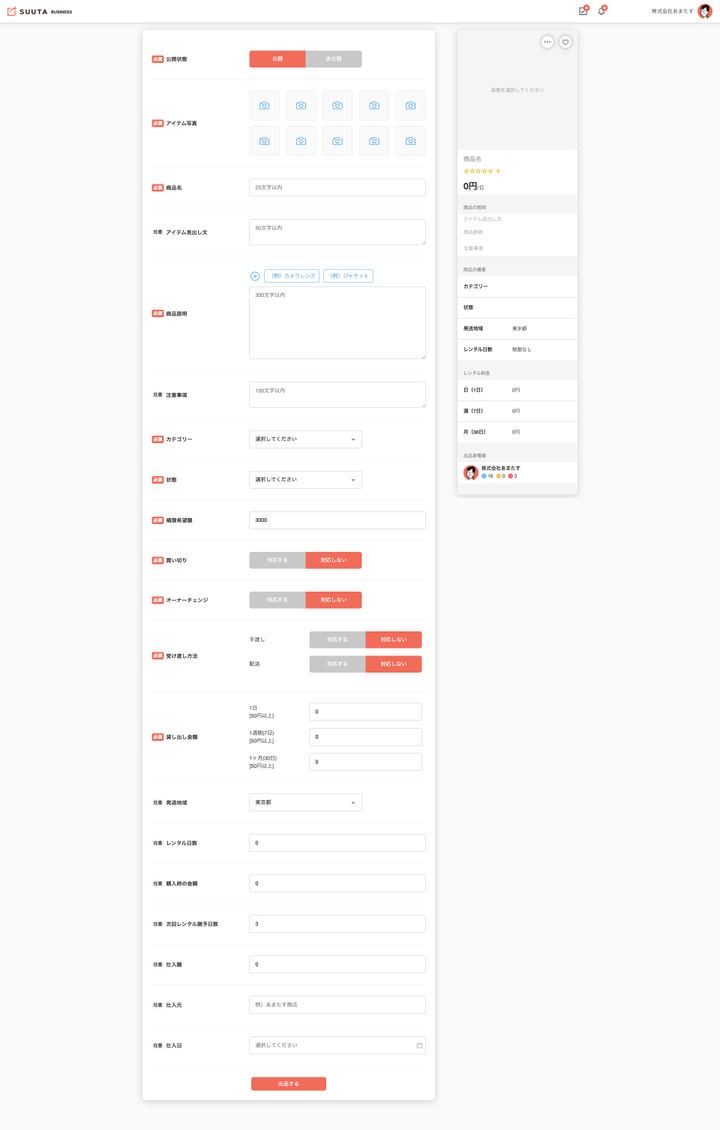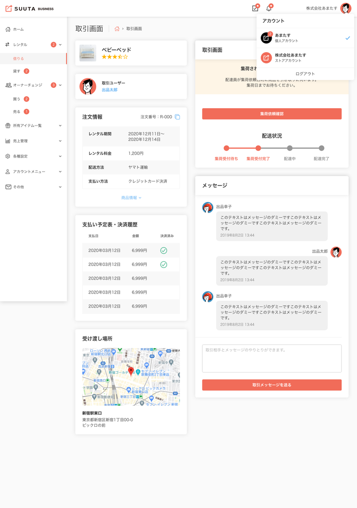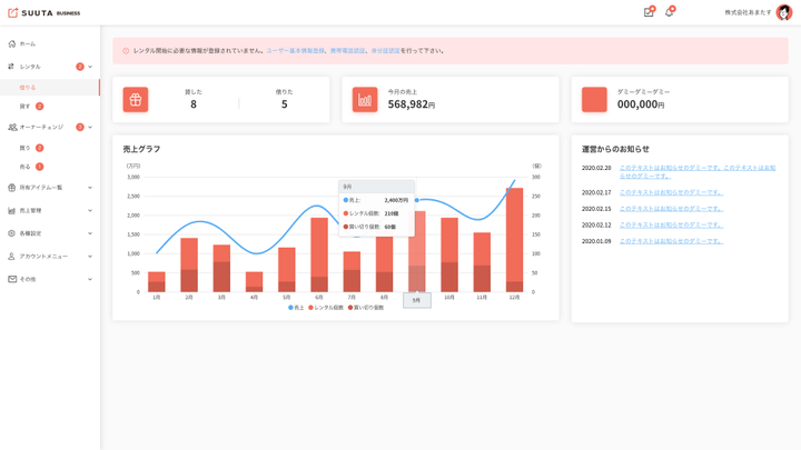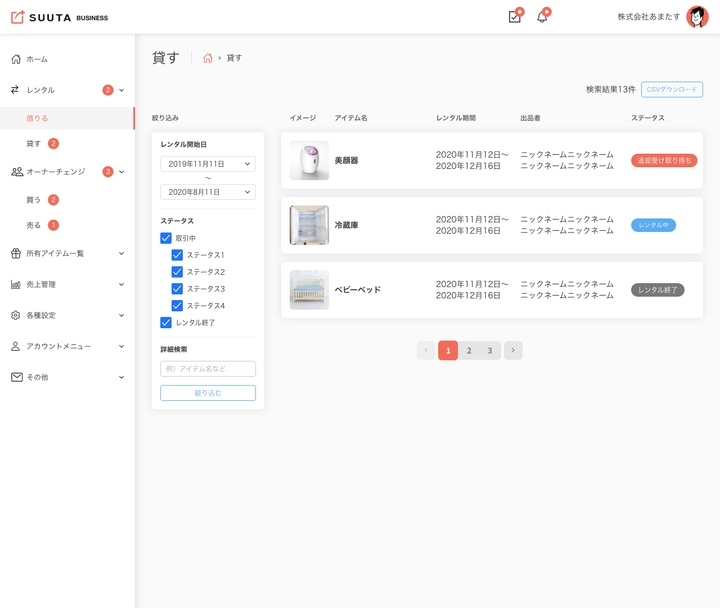 CtoC レンタルプラットフォーム SUUTA PC版(管理画面)