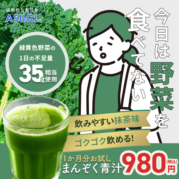 職業訓練では、とある青汁のWebマーケティングを題材に商材の外部環境・内部環境を分析し、仮説を立て施策を考案する実習を行いました。そのなかで、野菜不足の解消のために青汁を利用している方が多く、飲みやすさが訴求ポイントのひとつとして効果的であることがわかりました。実習ではバナーの作成まで求められませんでしたが、自主制作として学んだ訴求ポイントを視覚的に表現する練習としてこのバナーを作成しました。