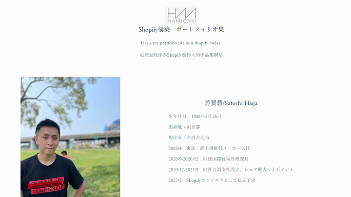 台湾進出を考える日本企業の営業代行、ECサイト構築(Shopify)、日本語教師として活動 / Shopifyエンジニア、日本語教師としても活動。