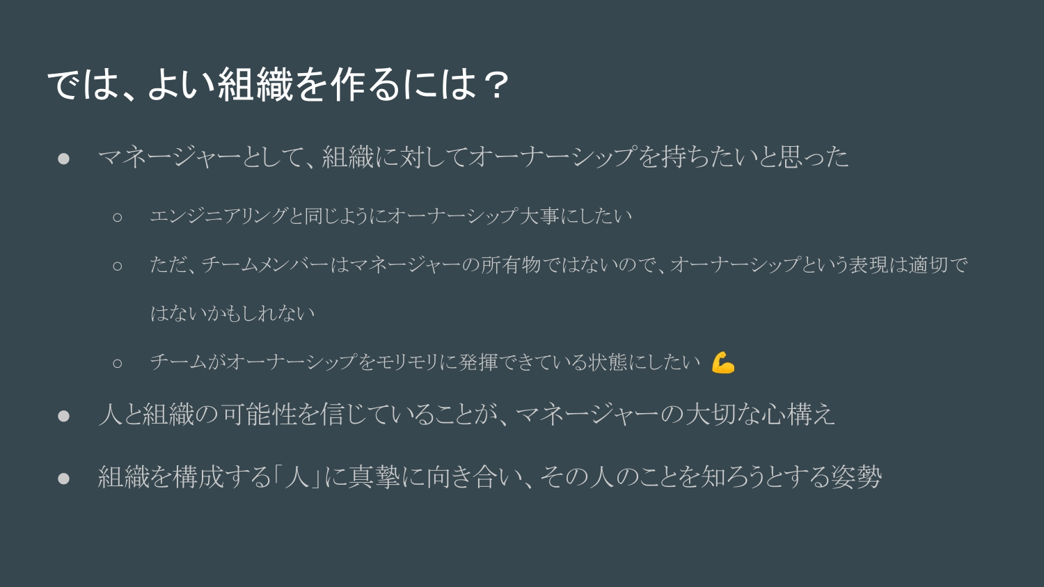 2022/12に入社し、主力サービス「カミナシ レポート」を担当するチームのエンジニアリングマネージャーを担当。マネジメント範囲を1チームから2チームに広げ、各チームのマネージャー育成を行い、セカンドラインマネジメントに業務領域をシフトさせた。