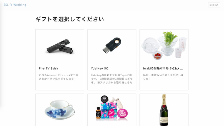 新郎新婦が自ら選んだものを引き出物のリストにできるシステム。 自分の結婚式の友人向けの引き出物として使いました。 フロントエンドはNuxt、認証はFirebase、サーバサイドはGoで作りました。