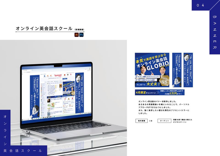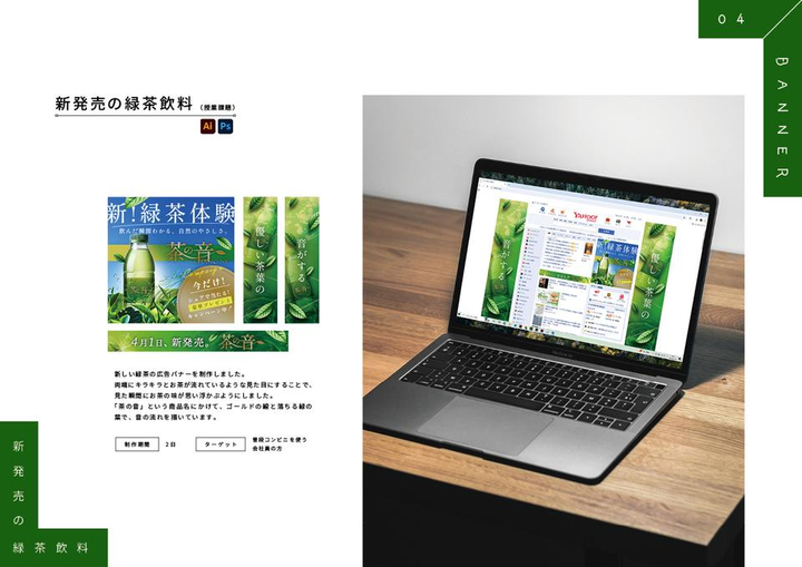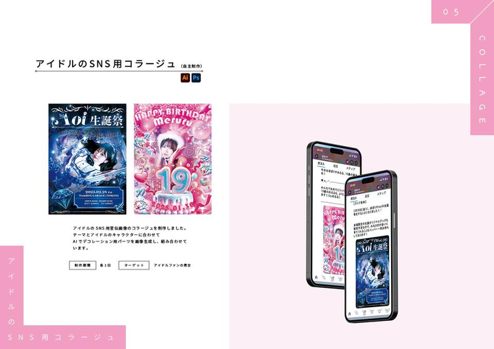 Illustrator、Photoshop、InDesignの基本的な使い方から、課題制作やグループワークなどでテーマ検討からコンセプト設計、制作まで一通り学びました。 現在はWeb制作を学んでいます。 2025年4月に卒業を予定しています。
