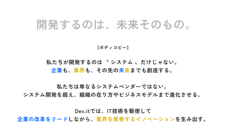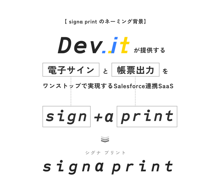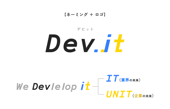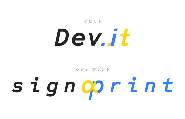 担当業務:ネーミング・コンセプト/トンマナ設計・ロゴ制作 ----------------- 【共通】 フォント:Sometype Mono カラー:黒(#2f2f2f)・青(#3580FF)・黄(#ffd600 ※コーポレートカラー) ----------------- SI事業部のサービス名「Dev.it」及び自社開発SaaSの「signaprint」のBI / VIを構築しました。