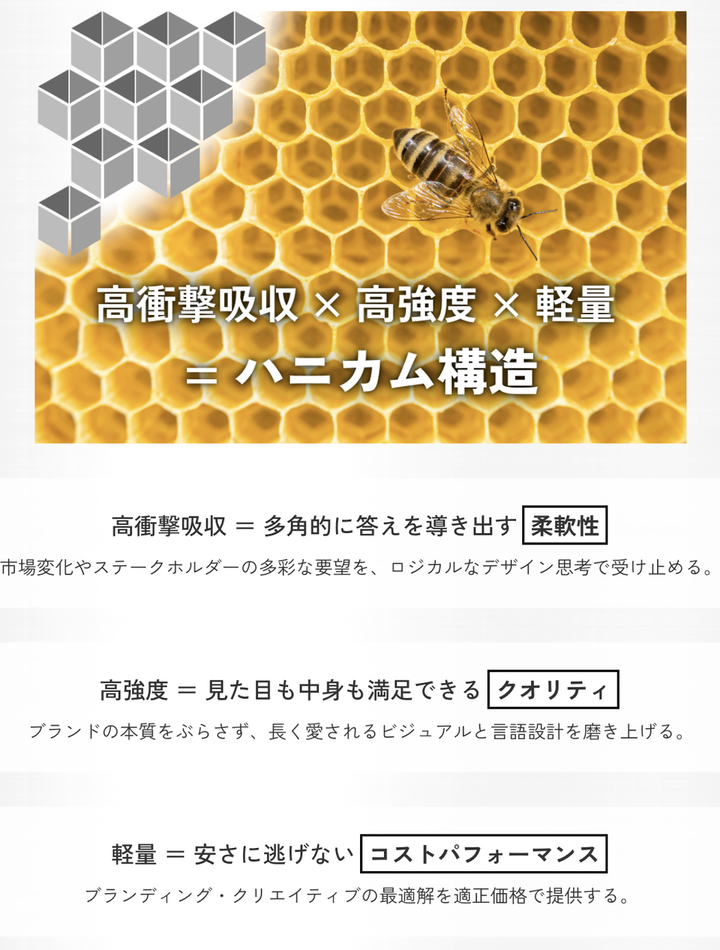 コンテンツや情報が溢れる現代において、心に残るのは〝 本質が際立つ洗練されたデザイン(COMPACT) 〟です。 クライアントには愛着を、消費者には余韻をもたらす。 そんなクリエイティブこそが、〝 効果を最大化する(IMPACT)〟と考えています。