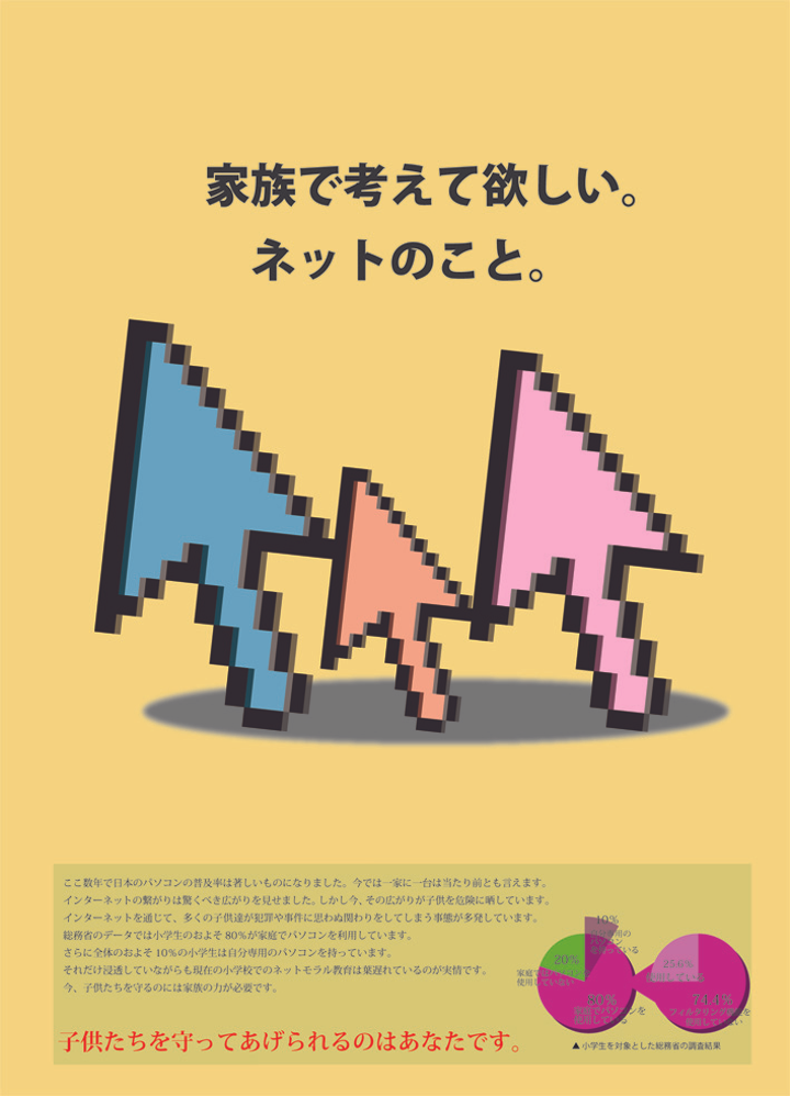 【ポスターデザイン】 自主制作作品。子供のネット利用に関して、家族単位でネットリテラシーを考えることを訴えるポスター。