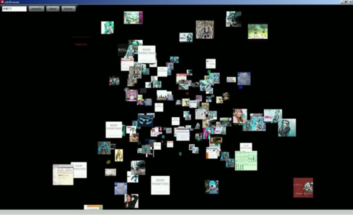 MashupAwardに出品するために作りました。 3D空間をブラウジングできるアプリです。Adobe AIR で作りました。 カウボーイビバップのエドが使ってたアレです。