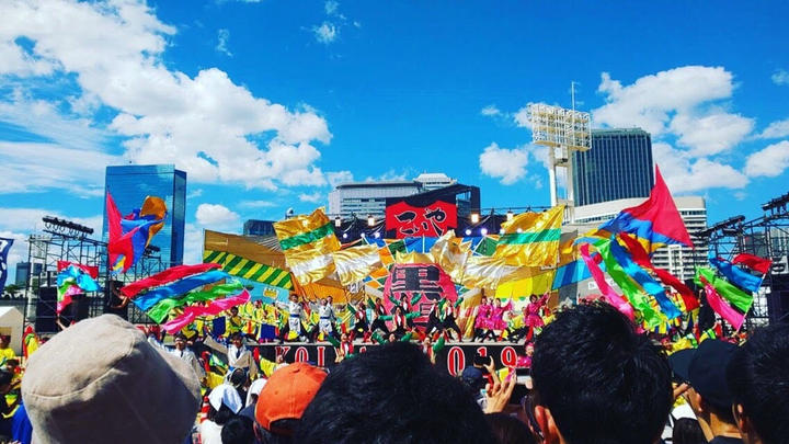 私が所属する近畿大学よさこいサークル洗心での演舞写真です! 私は120人以上のメンバーがいる中、10人しか踊ることのできない演舞の要となるパートを担当しました。観客動員数10万人を超える大会で踊ることはとても緊張しますが、責任感と度胸を身につけることができました!