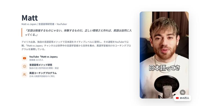 Nick氏(https://www.youtube.com/@nikkuniisan)・Matt氏(https://www.youtube.com/@mattvsjapan)との共同英語コーチング事業の立ち上げおよびマーケティング全般を担当しています。LP作成、LINE構築・運用、決済導線設計、販売導線の設計、全体進行管理を推進しています。