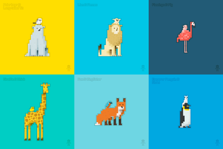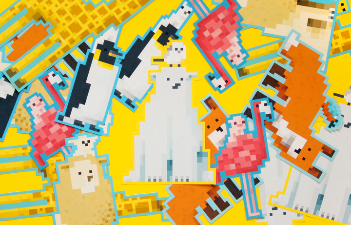 ピクセル調の動物ステッカー。2種類の動物が夕日にたそがれる。家具、カバン、パソコンなどに動物を住まわせよう。