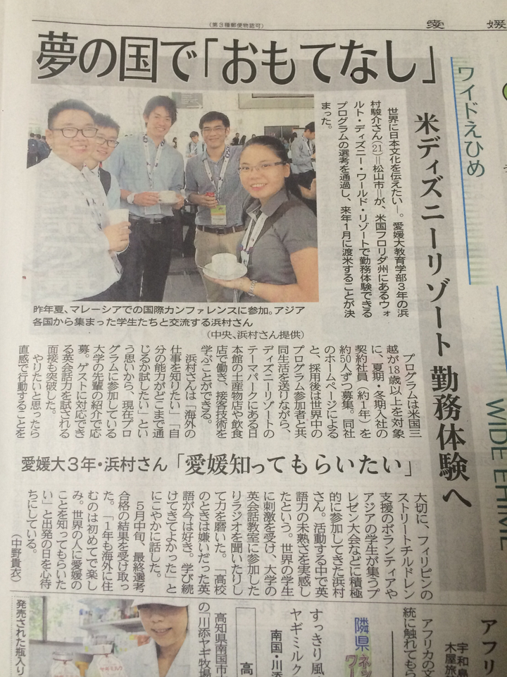 米国三越株式会社CRプログラム内定に際して、愛媛新聞に取り上げていただきました。 フロリダのウォルトディズニーワールドにて日本文化を伝える日本代表として、2017年1月より、お仕事してきます。