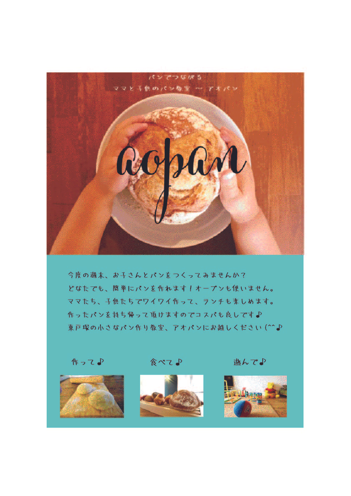 ・知人のパン教室のチラシ。 子連れのお母さん達を明確にターゲットにする事で近隣のパン教室(子連れは一応OK)と差別化をするため、ビジュアルもお子さんの手を使った。 ・教室のコンセプト作りのシート。依頼主からのヒアリングと、競合の分析を踏まえ、方向性を規定。これをベースにデザインへの落とし込みを行った。