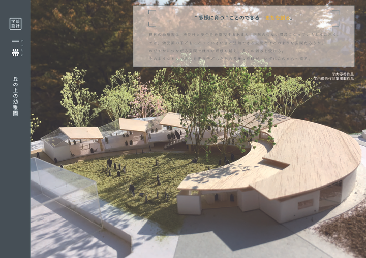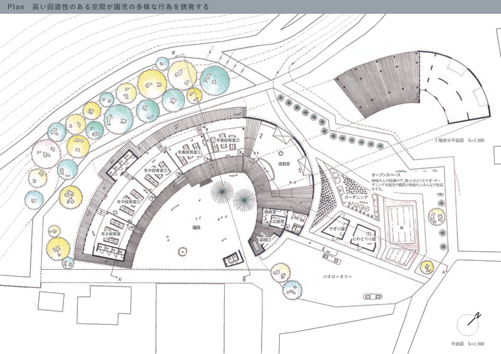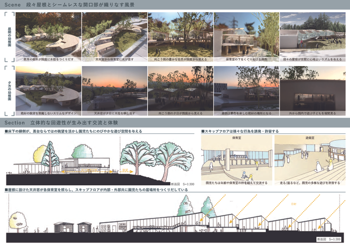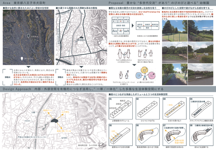 幼少期の体験は、その後の価値観の形成に大きく関わる大切な時期である。 自身の経験から、年齢や文化を越えてコミュニケーションをとることは、多様な価値観を育てることにつながると考える。 この幼稚園では、住宅街と開けた眺望の2面性をもつ高台の立地を生かし、自然と人とのつながりがゆるやかにのびのびと広がる。