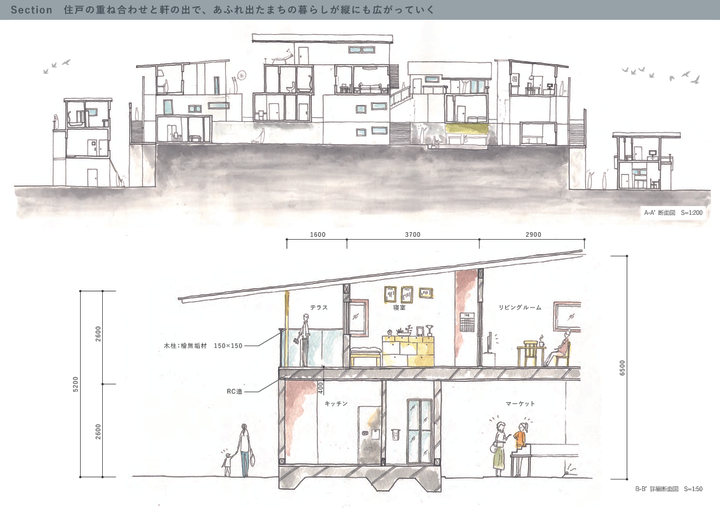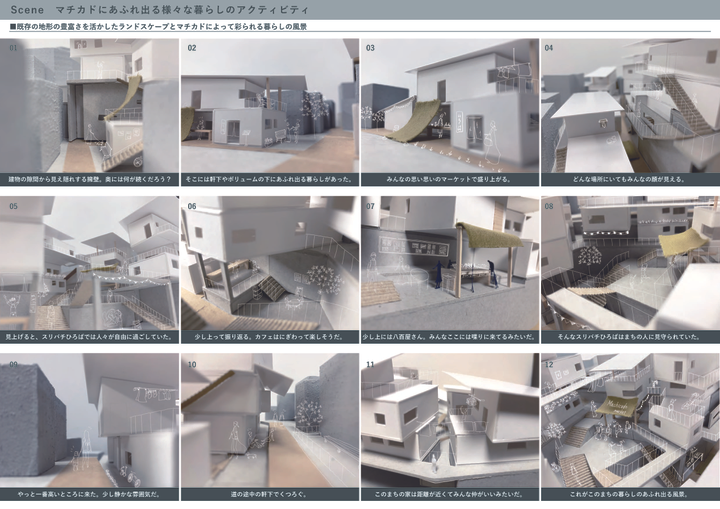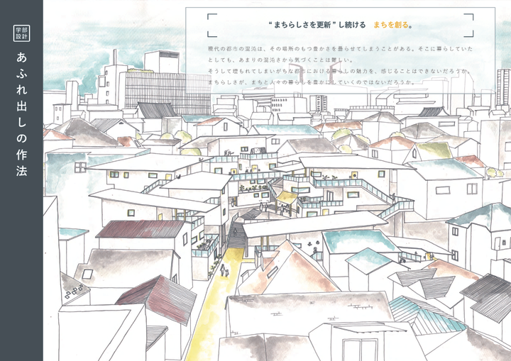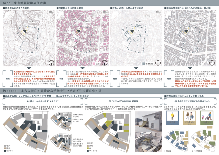 都内にある利便性の高い住宅・寺社仏閣・公園・商業施設の密集地。 しかしそこに住む住人は、限られた土地で生活を営み、その様子を見て窮屈さと不便さを感じた。 それぞれの生活があふれ出すことを許容し共有することで、生活の場を広げる。そんなまちの姿は、これからの新しい魅力の一つとして形成されていく。