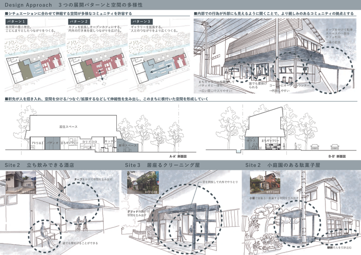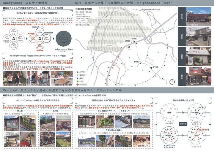 コロナ禍で従来の生活様式が見直されはじめ、自身の住まいを中心とした生活圏に目が向くようになった。 まちの住人の " 軒先 " にささやかながらも充実した空間を見繕い、人々の拠り所とする。 誰もが自分の居場所を見つけ、創り、つながる。