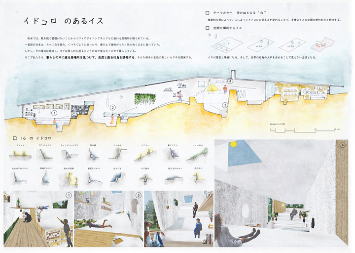 本コンペで特別審査員賞として選出。 テーマは「椅子が主役の、ユニークなリビング空間」。 主にメインの断面パースやダイアグラムなど、手描きのイラストを担当した。 URLは受賞作品の紹介ページに続きます。