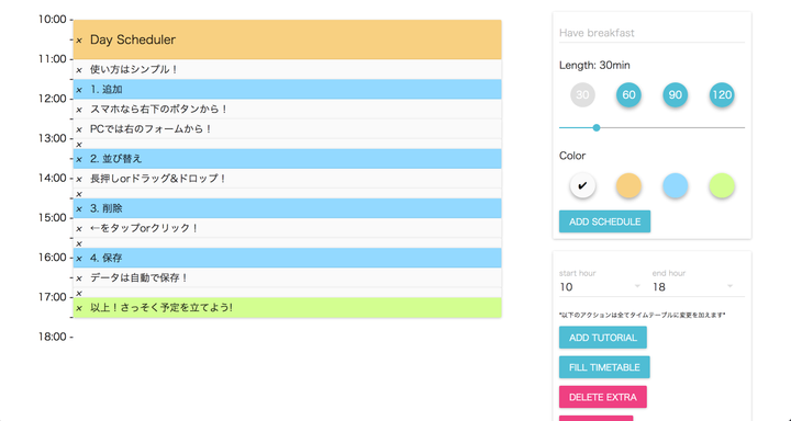 3連休のときにふと思い立って作ったReactアプリです。 1日の予定を立てることができます。 ブログもそのときに書いたので、よかったら見てください! https://medium.com/@shunichitakewa/4531d88cd0ec