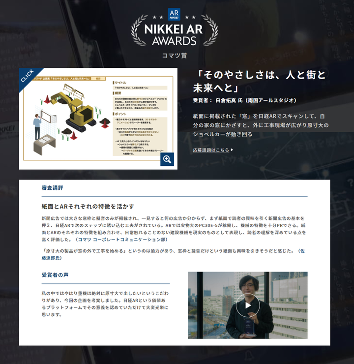 「そのやさしさは、人と街と未来へと」第二回 NIKKEI AR AWARDS コマツ賞 受賞(2020年)