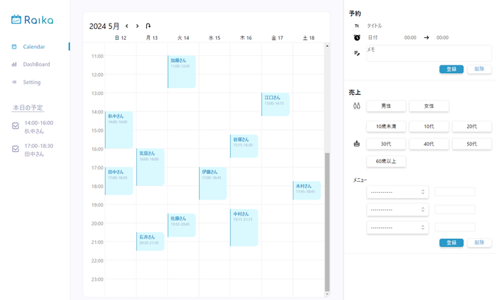 □サービス概要 Raikaは、個人経営で美容師を営む父親の「予約と売上の管理を改善したい」という想いを聞き、父親のニーズに特化した統合予約・売上管理システムです。 □紹介動画 https://www.youtube.com/watch?v=ZnxGBfYCIYg