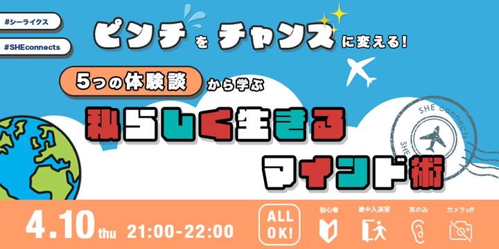 SHElikes海外コミュニティ「SHEconnects」にて、 オンラインイベント用バナーのデザインを担当しました。 イベントテーマ 「ピンチをチャンスに変える!5つの体験談から学ぶ 私らしく生きるマインド術」をもとに、 ✔ 前向き ✔ ワクワク感 ✔ 海外コミュニティらしさ を意識したデザインに仕上げています。 ポップな配色と親しみやすいフォントを使用し、 一目で内容が伝わる構成を意識。 また、SNSでのシェアを想定し、 タイム・日時・参加条件が直感的に分かる配置に設計しました。