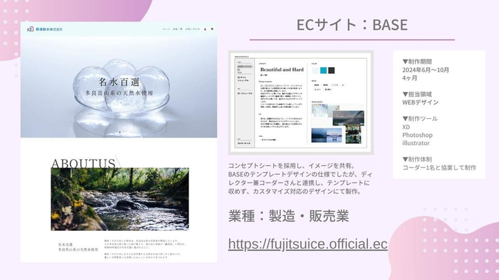 ▼制作期間 2024年6月〜10月 4ヶ月 ▼担当領域 WEBデザイン ▼制作ツール XD Photoshop illustrator ▼制作体制 コーダー1名と協業して制作 コンセプトシートを採用し、イメージを共有。 BASEのテンプレートデザインの仕様でしたが、ディレクター兼コーダーさんと連携し、テンプレートに収めず、カスタマイズ対応のデザインにて製作。