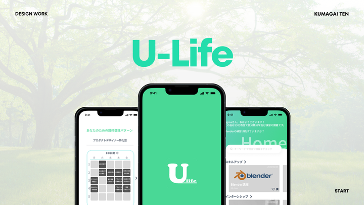 大学新入生が抱える「将来のために何を学ぶべきか」という履修登録の不安を解消するため、希望する将来像から逆算して最適な履修プランを提案し、学生生活をサポートするスマートフォンアプリ「U-Life」を企画・デザインしました。