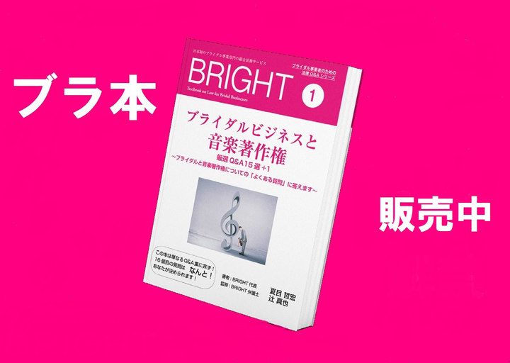 史上初のブライダルビジネス「だけ」を対象とした音楽著作権解説本。 ブライダルビジネスを展開する上で必要な15個のQ&Aを通して、音楽著作権についての基礎知識をほぼ網羅でき、かつ16個目のQは自ら設定できるという特典付き。 販売価格:1500円(税込) 通信販売受付中