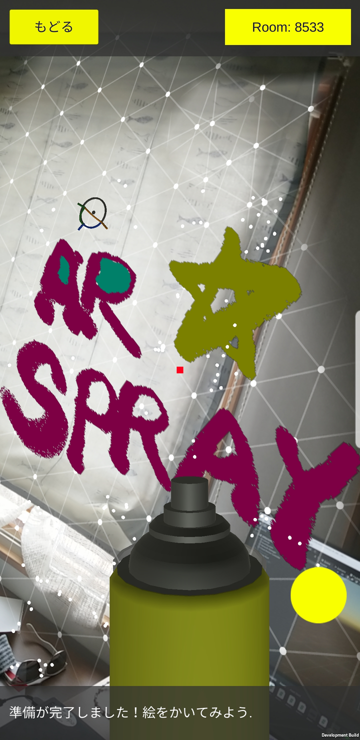 近年のスマートフォンの普及による、親子のコミュニケーション不足と、子供の絵を描く機会の減少の問題に対してのソリューションとして開発した。カメラ越しに同じものを見て描画体験の共有をすることで、新たなコミュニケーションが生まれると考えている。 描画は、平面検出をされた壁などの平面に対して、実際のスプレーと同じような操作方法で描画することが出来る。親子で複数端末でプレイし、描画内容の共有も可能である。また、アプリ内の3DモデルはMayaを使用して作成した。学内優秀賞を受賞し、大学パンフレットに掲載中。
