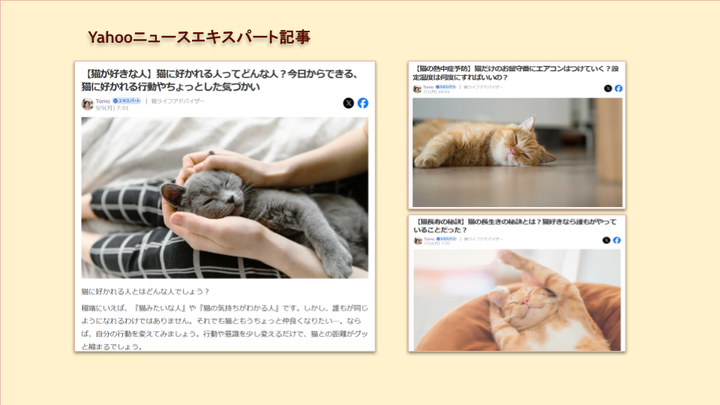 猫ライフアドバイザーとして猫との暮らしや健康に関連する記事を投稿。 記事のネタ、構成、執筆を行っています。 最高PV数は 約75,000PV 1記事 1,000文字前後、月4本の投稿を目安にしています。