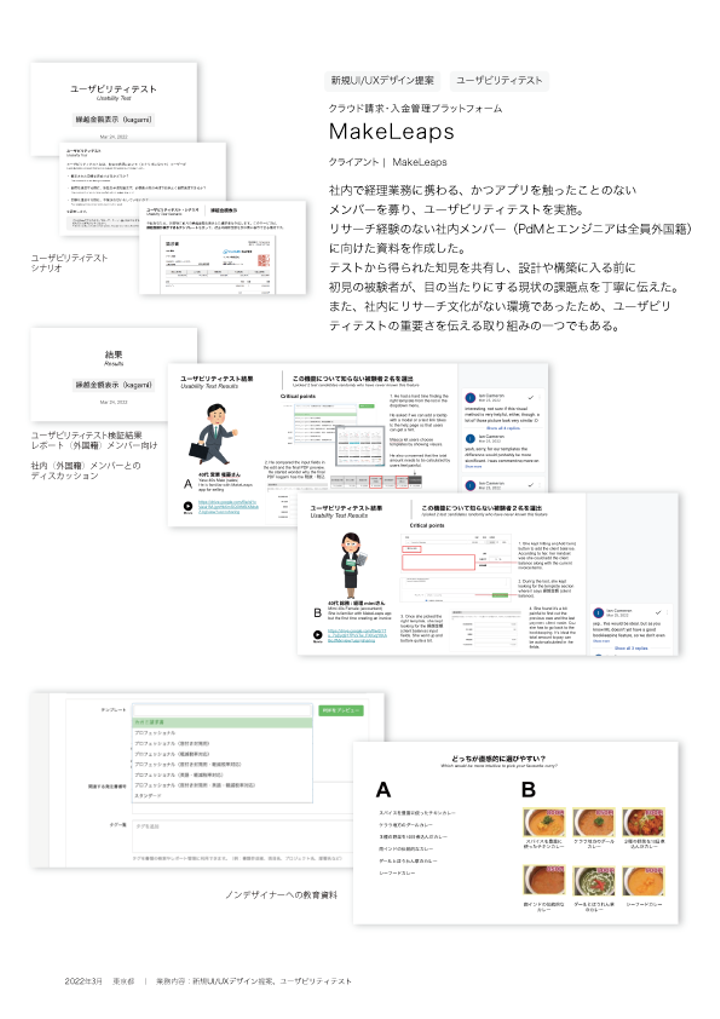 社内で経理業務に携わる、かつアプリを触ったことのないメンバーを募り、ユーザビリティテストを実施。リサーチ経験のない社内メンバー(PdMとエンジニアは全員外国籍) に向けた資料を作成した。 テストから得られた知見を共有し、設計や構築に入る前に初見の被験者が、目の当たりにする現状の課題点を丁寧に伝えた。 また、社内にリサーチ文化がない環境であったため、ユーザビリティテストの重要さを伝える取り組みの一つでもある。