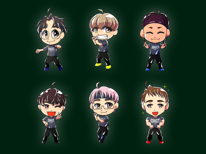 HADOという競技に出ているチーム「DIRECT」のメンバーのキャラクターイラストを制作しました。 似顔絵としての使用を想定し、今後のグッズ展開(アクキーなど)も考慮したイラストです。 それぞれの好きな色を足元で表現、それぞれのキャラクター性を雰囲気に入れています。