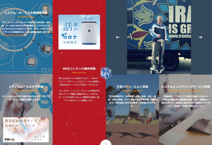 当社では、自社に限らず、お客様のシステムやサービスの企画から設計・開発・運用の業務を担っております。 その中で、自社においては、下記の事業を立ち上げております。 各事業) ・システムインテグレーションサービス事業(SI) ・Webコンテンツ制作事業 ・感染症予防対策事業 ・エンターテイメント事業 ・システムエンジニアリング事業(技術者派遣) ・メディカルヘルスケア事業(美血Navi)