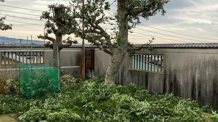 庭木の剪定。脚立を使い、木に登り、剪定バサミを使って1時間切り続けます。 外構工事のお手伝いをすることもあります。写真は研修施設に池を設置する様子です。30キロある石を一つ一つ組み上げて完成させます。