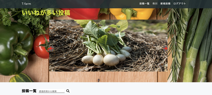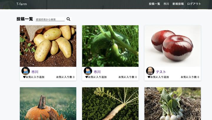 ※現在停止中 自分でサービスを作りたいと考えていました。そこで形などが悪く食べる分には問題ないが市場に出せないような農作物の売買できたらいいなと思い、ECサイトに移り変われるようなWebアプリケーションの開発を独学で行いました。 ログインページの簡単ログインボタンから テストユーザ としてログイン可能です # 使用技術 - Ruby 2.6.1 - Ruby on Rails 5.4.2 - MySQL 8.0.16 - Nginx 1.17 - Docker - CircleCI - AWS - VPC - ECS - EC2 - ECR - ALB - RDS - S3 - ACM - Route 53(ドメインはawsではないです) - SES -CloudWatch # 機能一覧 - ユーザ登録(devise) - 画像アップロード - carrierwave - 投稿機能 - 画像アップロード - carrierwave - いいね機能(Ajax) - コメント機能(Ajax) - いいねが多い投稿表示機能 - 投稿のページネーション機能(kaminari) 詳しくは GitHub: https://github.com/takeruun/t-farm