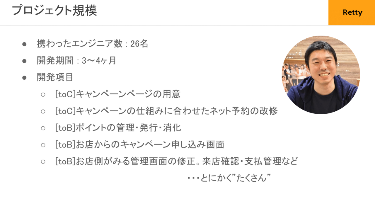 toC / toB Web開発部門のマネジメントを担当。2021年にはコロナ禍を受けて飲食事業支援のため国が推進したGo To EatキャンペーンのRetty内開発責任者を務めた。