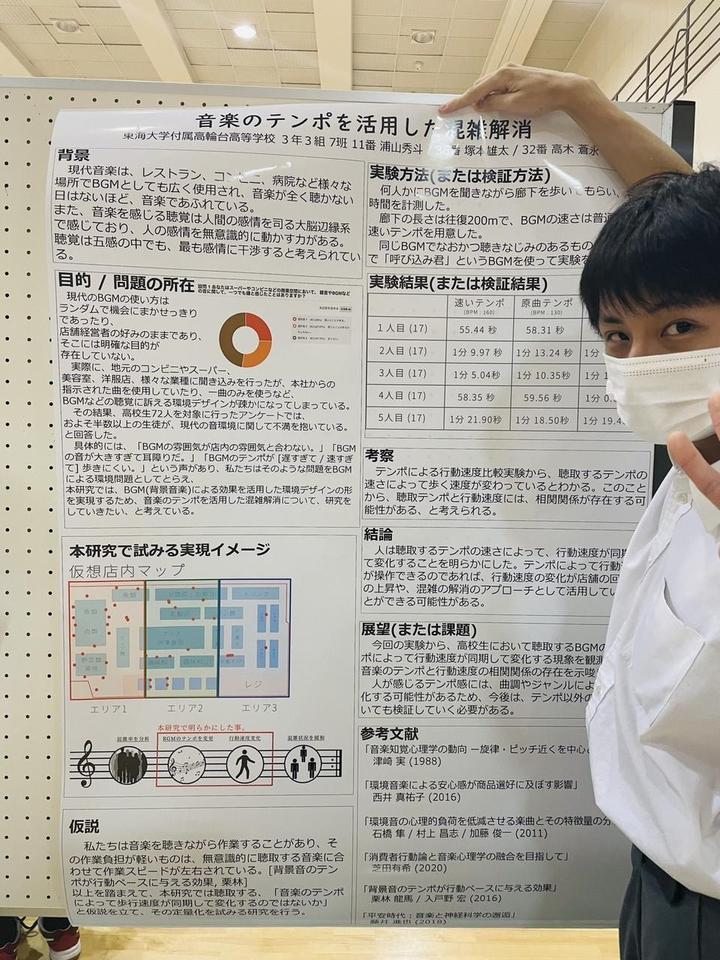 高校生時代に「音楽のテンポを活用した混雑解消」というテーマで探求活動を行っておりました。 自分が持つ"音楽"と"コンピュータ"のテクノロジーを掛け算して何かできないか。ということに興味があり、自由に探求活動を行っていました。 実際に、昭和女子大学の池上氏 や東海大学の撫中氏 に直接お話を伺い、高校生ながら知見を深めておりました。