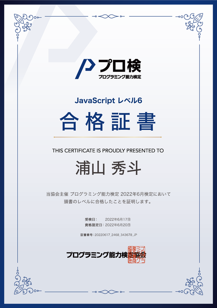 高校3年生の時に、新しくプログラミング能力検定という検定が行われました。 私は、第一回試験において、最高難易度のレベル6をJavaScriptで受験し、合格することができました。
