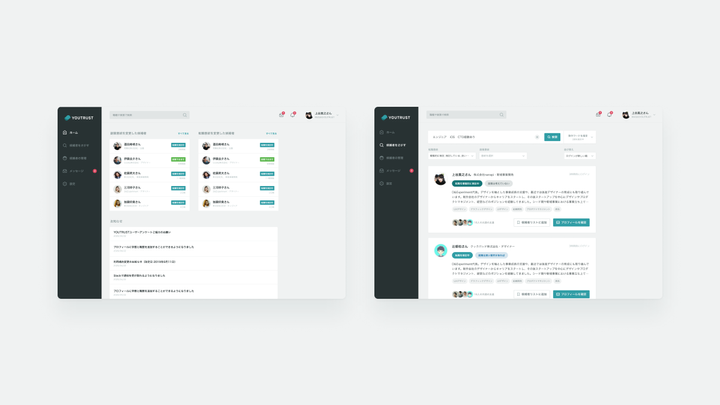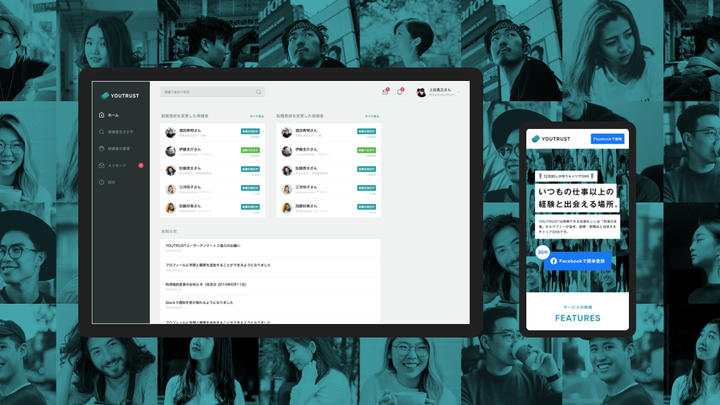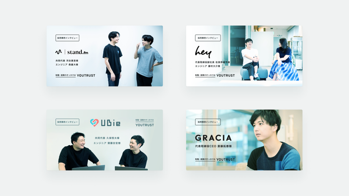 キャリアSNS「YOUTRUST」のVIリニューアル、B2Bプロダクトデザインをお手伝いしました。リブランディングに伴うアウトプットのトータルディレクションも担当し、写真撮影やクオリティコントロールなど継続的な支援にも力を入れています。