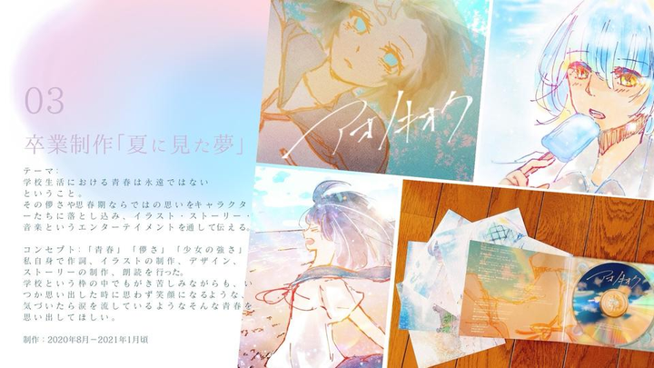 ▼デジタルハリウッド大学 アートディレクションを専攻し、グラフィックデザインや広告発想の授業を受け、「自分の中にあるものを発想、表現しどうやって伝えるか、どうすれば伝わるか」を学ぶ。 グラフィックデザインや広告の他にシナリオ制作についても学ぶ。 3年次に1年間休学し、ANYCOLOR株式会社に就業。版権事業部部長としてMDを担当。