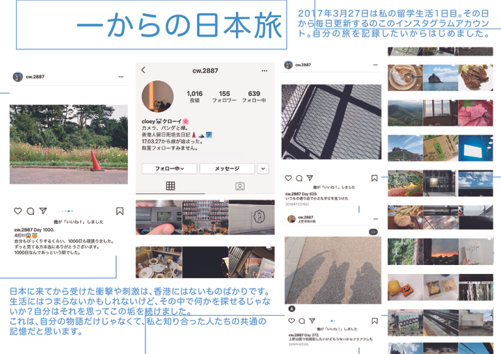 2017年3月27日は私の留学生活1日目。その日から毎日更新するのこのインスタグラムアカウント。自分の旅を記録したいからはじめました。 日本に来てから受けた衝撃や刺激は、香港にはないものばかりです。生活にはつまらないかもしれないけど、その中で何かを探せるじゃないか?自分はそれを思ってこの垢を続けました。 これは、自分の物語だけじゃなくて、私と知り合った人たちの共通の記憶だと思います。